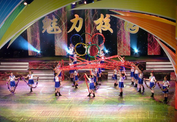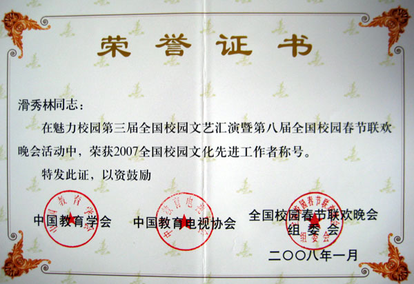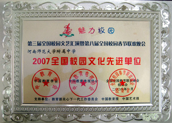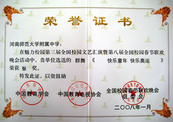 2008年元月,由校团委书记杨宝刚老师、校艺术团张婷老师编排指导的群舞《快乐童年 快乐奥运》入围“魅力校园——第三届全国校园文艺汇演暨第八届全国校园春节联欢晚会”,作为我市入选的唯一节目应邀赴京演出。元月28日,颁奖典礼在人民大会堂隆重举行。我校节目荣获银奖,我校荣获“2007全国校园文化先进单位”,滑秀林校长荣获“2007全国校园文化先进工作者”称号。