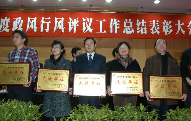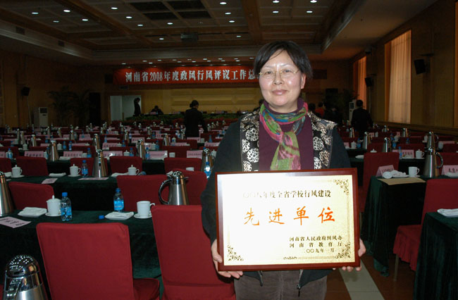 2009年1月18日,河南省人民会堂三楼多功能厅,河南省2008年度政风行风评议总结表彰大会隆重举行,省领导叶青纯、宋璇涛等参加了大会。我校党委书记张丁兰作为受表彰单位的代表从省领导手中接过沉甸甸的奖牌。我校被评为2008年度河南省学校行风建设先进单位,是我校近年来坚持依法办学、自觉规范招生收费行为、努力办人民满意教育的结果。