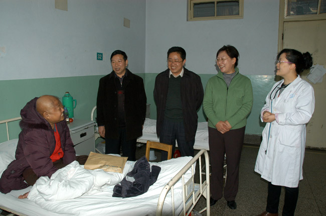 在医院病房里,别久芳手捧着沉甸甸的钱款,情绪显得十分激动,对校领导及全体教职工的这份真情关爱表示深深的谢意。看望之时,在场的医护人员也对别女士赞不绝口,称她为“抗癌英雄”,是值得所有病友乃至健康人学习的榜样。最后,校领导鼓励她继续与病魔搏斗,并祝愿她早日康复,再创生命奇迹。(文:齐晋 爱平 图:增建)