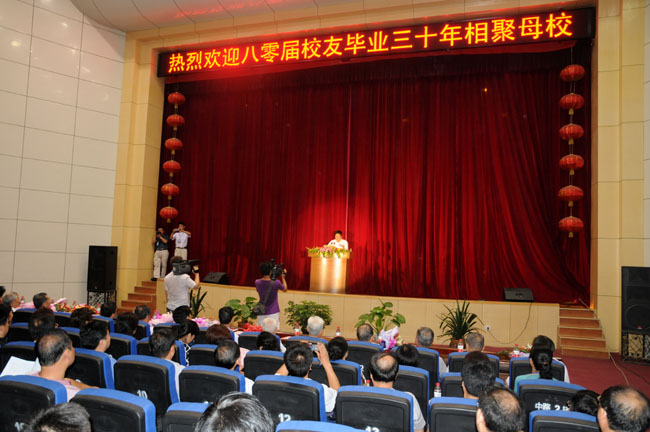 9:20,校领导、老教师代表和众校友集体合影后,又进行了第二项议程:80届同学会成立大会。大会在西校区礼堂举行。会上,刘黎校长热情致辞。他向80届校友概要介绍了母校30年来的发展变化以及近年来所取得的突出办学成就,并向众校友提出了几点殷切的希望:希望他们“常回家看看”,多为母校建设发展建言献策,并祝愿各位校友在自己不同的事业领域做出更加优异的成绩。接着,80届同学会会长邹健向大家报告了同学会的筹备经历,秘书长徐卫河宣布同学会正式成立。之后,副会长解建新介绍了同学会的宗旨,老校长李天刚同志致贺辞。专程从美国返校的著名青年生物学家、美国科学院院士王晓东作为校友代表发表了特别的感言。最后,全体校友还观看了校艺术团专门为他们精心准备的文艺节目表演。