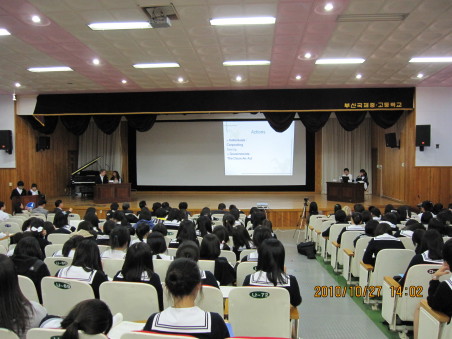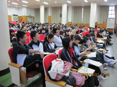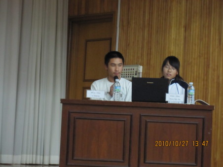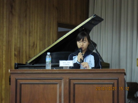 27日上午,按照校方安排,刘齐晋副书记向韩国师生作了一场关于中华文化的精彩学术报告,由曹萍老师作现场英语翻译。报告中,刘书记详细生动地向他们介绍了中国文化、社会发展的历史和现状,以及自古以来中韩两国的友好往来。韩国学生对刘书记的报告产生了极大的兴趣,现场气氛热烈。下午,我校代表团参加了由釜山国际中学主办的以全球变暖为主题的学生英语论坛,与会代表包括来自韩国、中国、新加坡、瑞典等不同国家的学生共200多人。我校高二年级7名学生代表,在带队老师杨楠、曹萍的指导下,积极准备,并参加了交流。卢海鹏、张潇哲两位同学登台发表了英语演讲,齐文婷同学对客队演讲作了现场点评。会后,来自四国的学生欢聚一堂,还进行了精彩纷呈的联欢文艺演出。