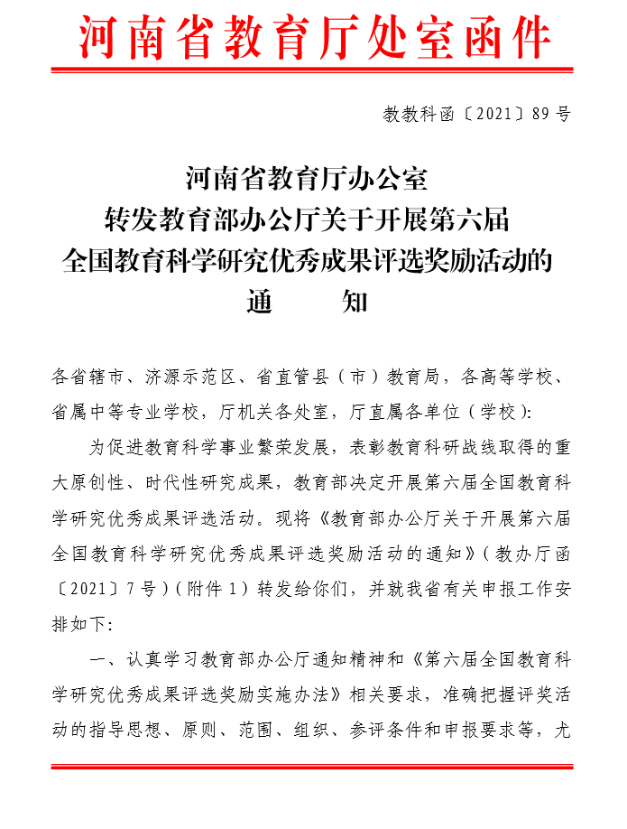 附件1:河南省教育厅办公室 转发教育部办公厅关于开展第六届 全国教育科学研究优秀成果评选奖励活动的通知