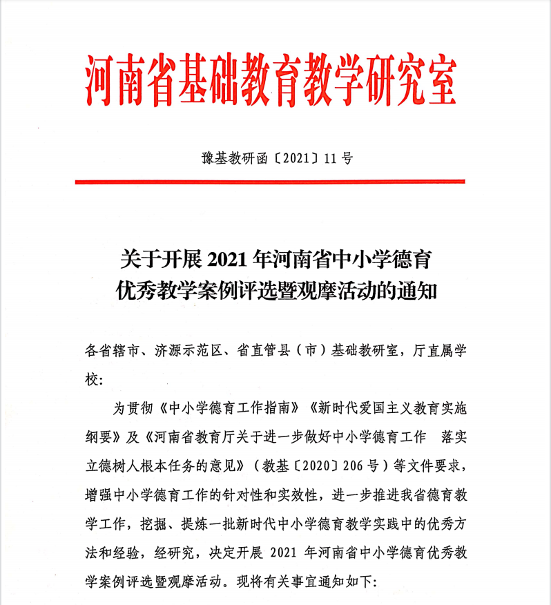 关于开展2021年河南省中小学德育优秀教学案例评选暨观摩活动的通知