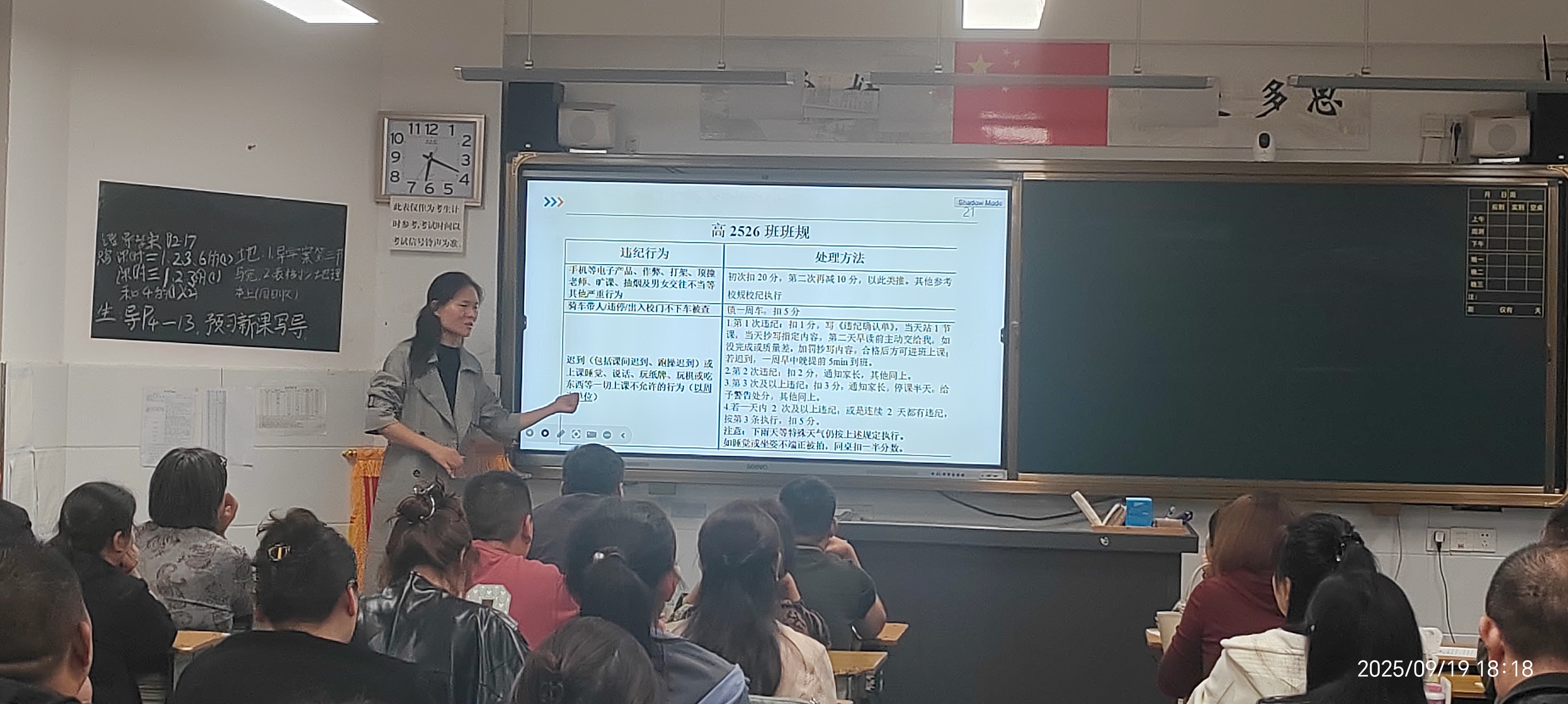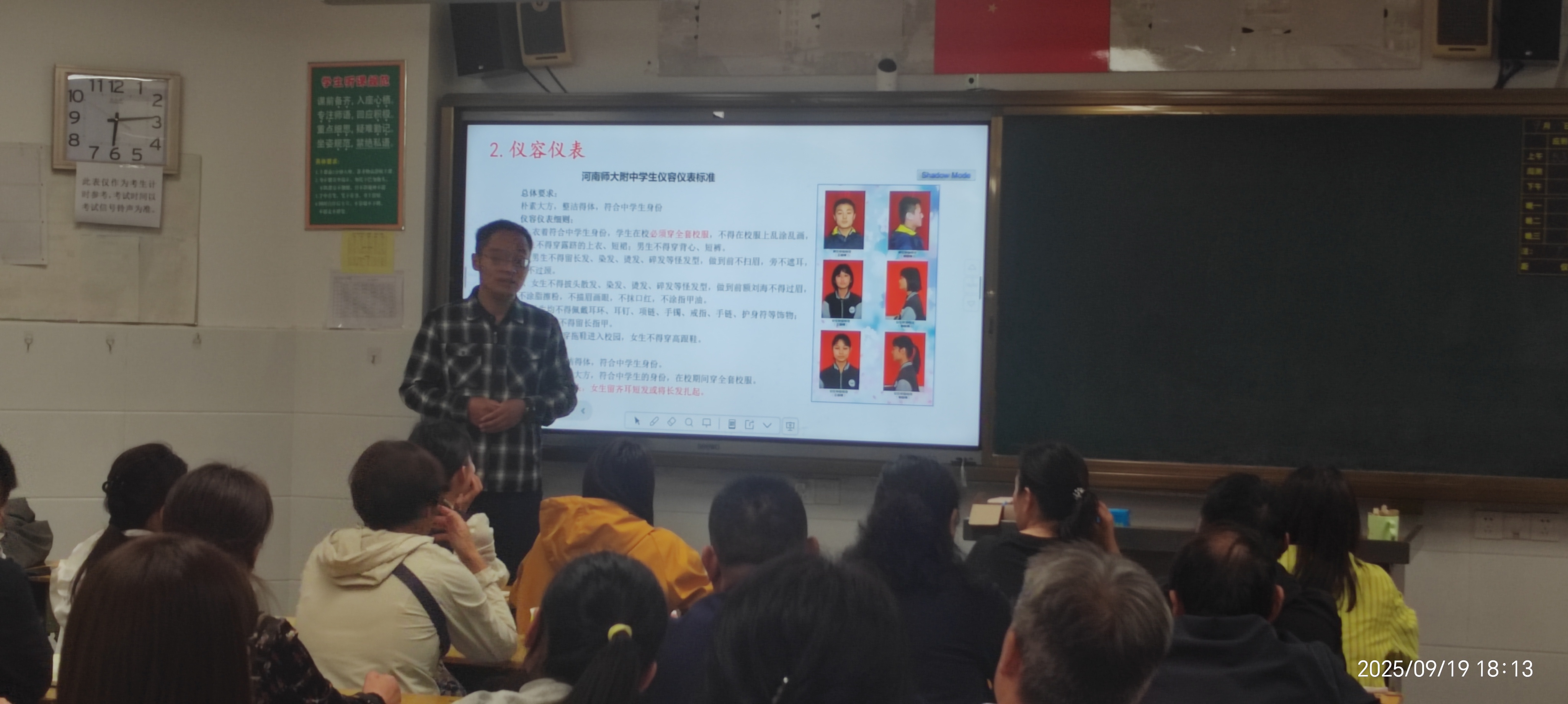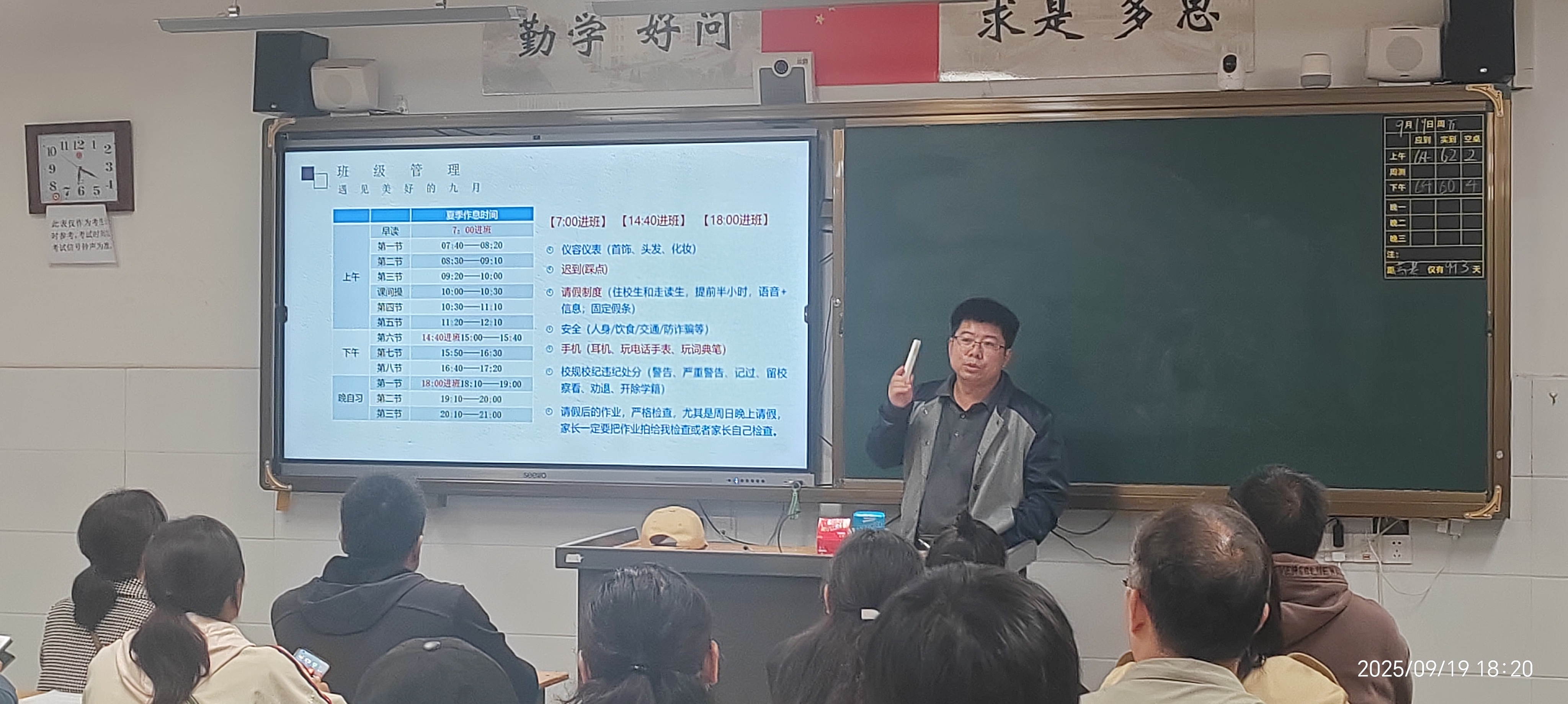 最动听的旋律,是家校同频共振的回响;最理想的教育,是家校协同合作。各班班主任就班级基本情况作详细介绍,包括班级人数、男女比例、班主任及科任老师简介等,并通过回顾军训期间的精彩瞬间,展现了新生昂扬向上的精神风貌,也增强了家长对班级的认同与信任。同时,各班主任向在坐家重点长解读相关校规班纪,涵盖作息安排、迟到、手机管理、仪容仪表、校服规范等内容,体现年级“宽严相济、规范育人”的管理理念。针对“初高中学习差异”,班主任从知识容量、思维深度、学习方法等多维度展开分析,特别强调高中阶段对自主学习与深度思考能力的更高要求。此外,还就“5+2=0”教育现象及“双休政策”下的时间管理问题与家长深入交流,倡议家校协同、形成合力,避免5天在校教育效果被2天家庭放松所抵消,共同促进学生持续进步。