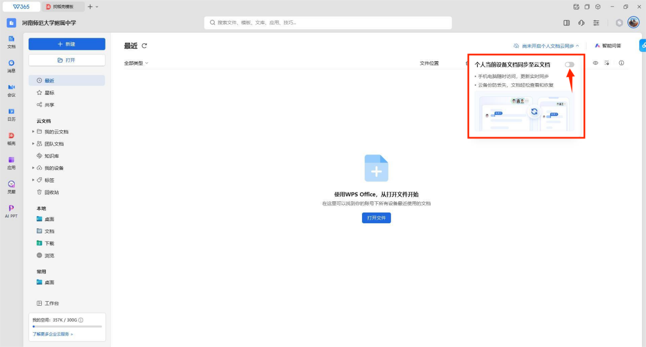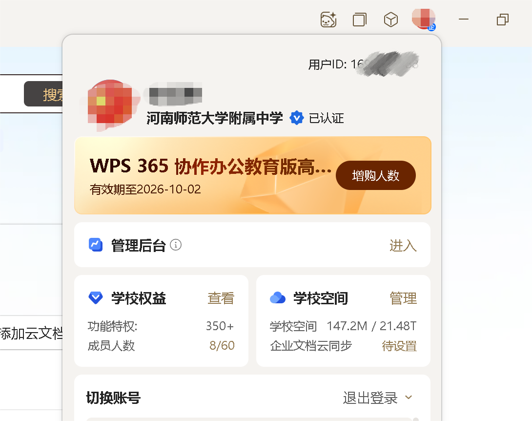 解决办法:在WPS客户端中同时登录学校账号和个人账号,下次启动WPS客户端时显示河南师范大学附属中学的标志。