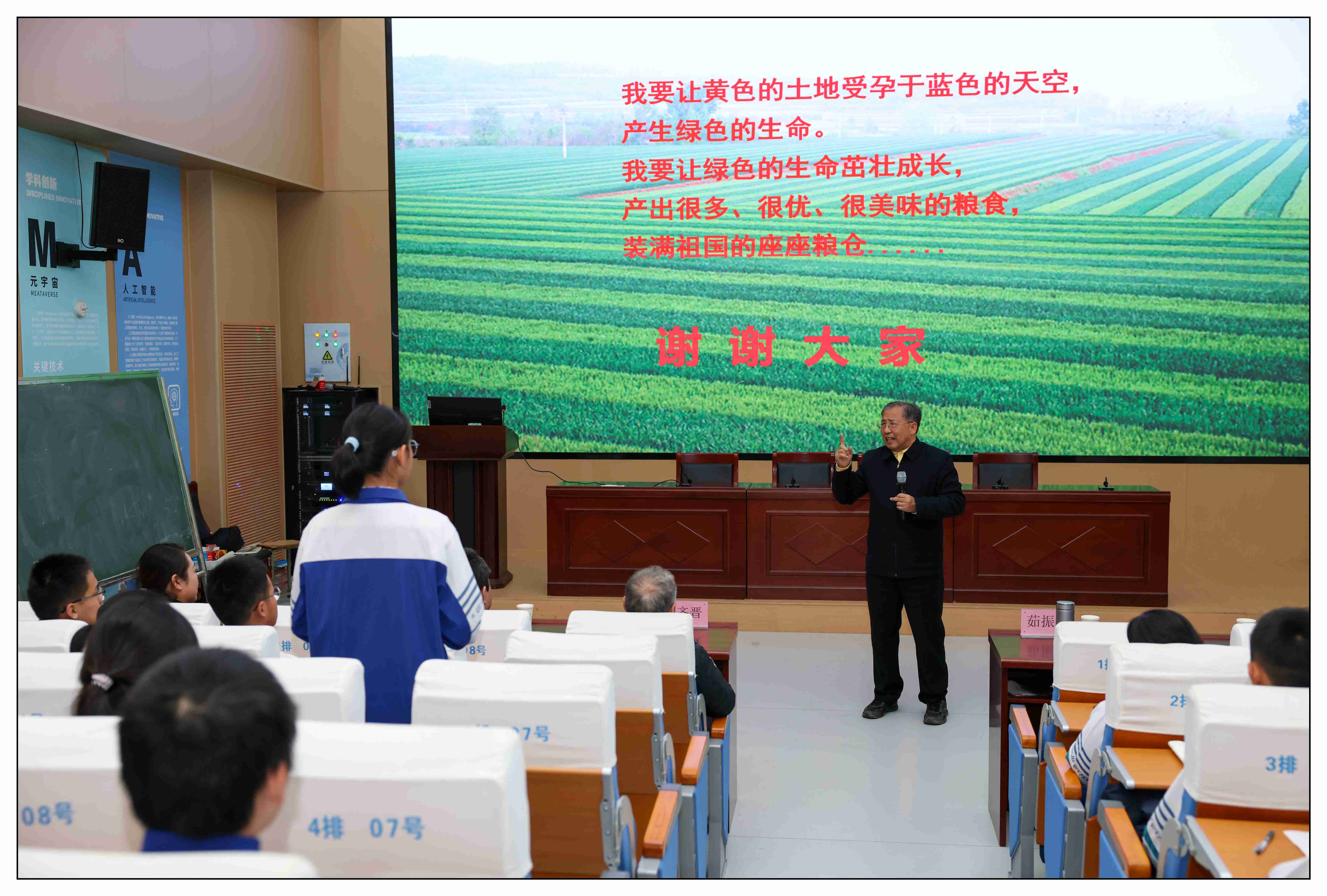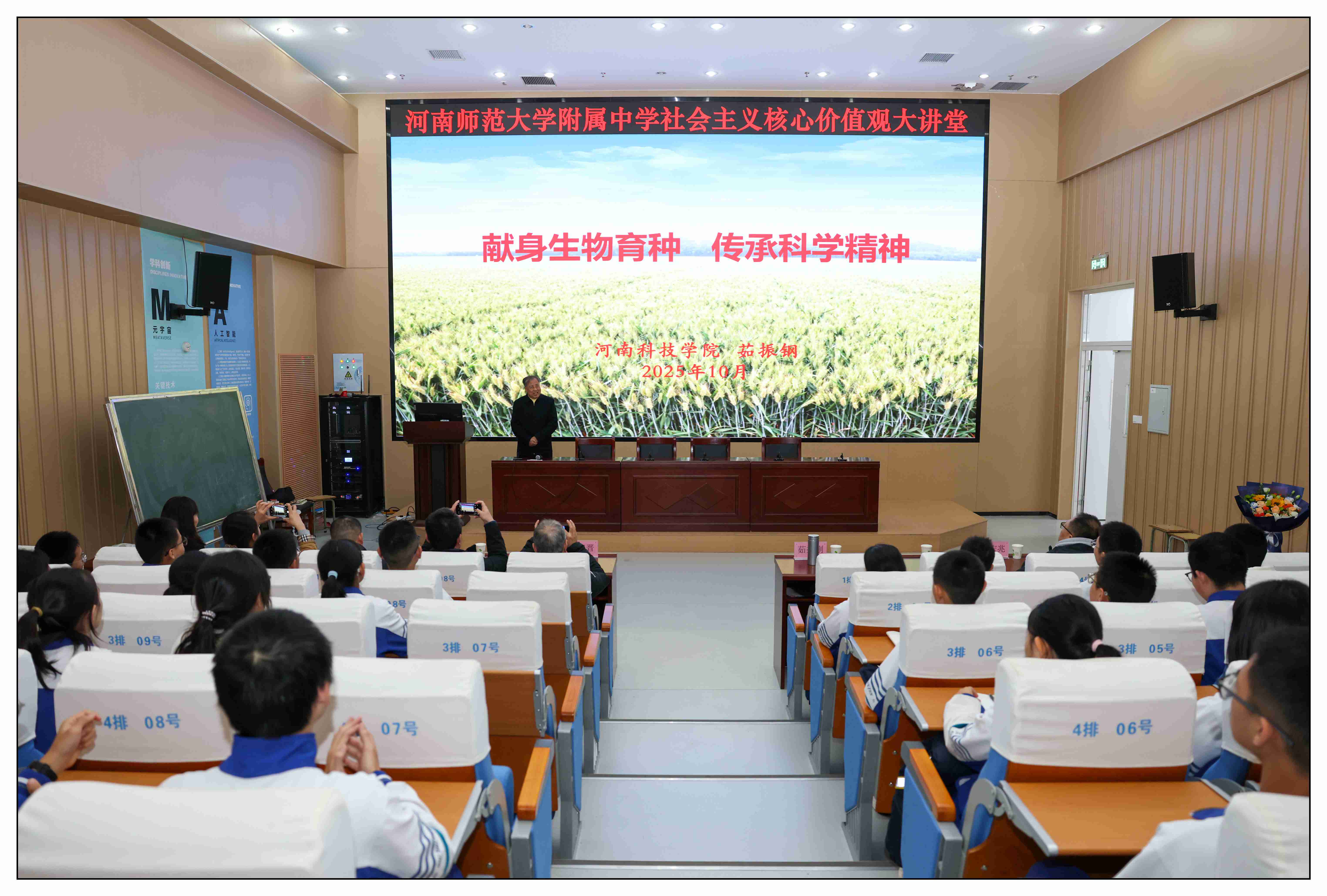 大力弘扬科学家精神,助力拔尖创新人才培养。10月20日下午,全国著名小麦育种专家、河南省小麦研究会副理事长、河南省“新时代宣讲师”茹振钢教授应邀走进河南师范大学附属中学社会主义核心价值观大讲堂,围绕“爱国•敬业”关键词,以“献身生物育种,传承科学精神”为主题,为初三年级师生代表带来了一场兼具科学魅力与家国情怀的科普思政报告。