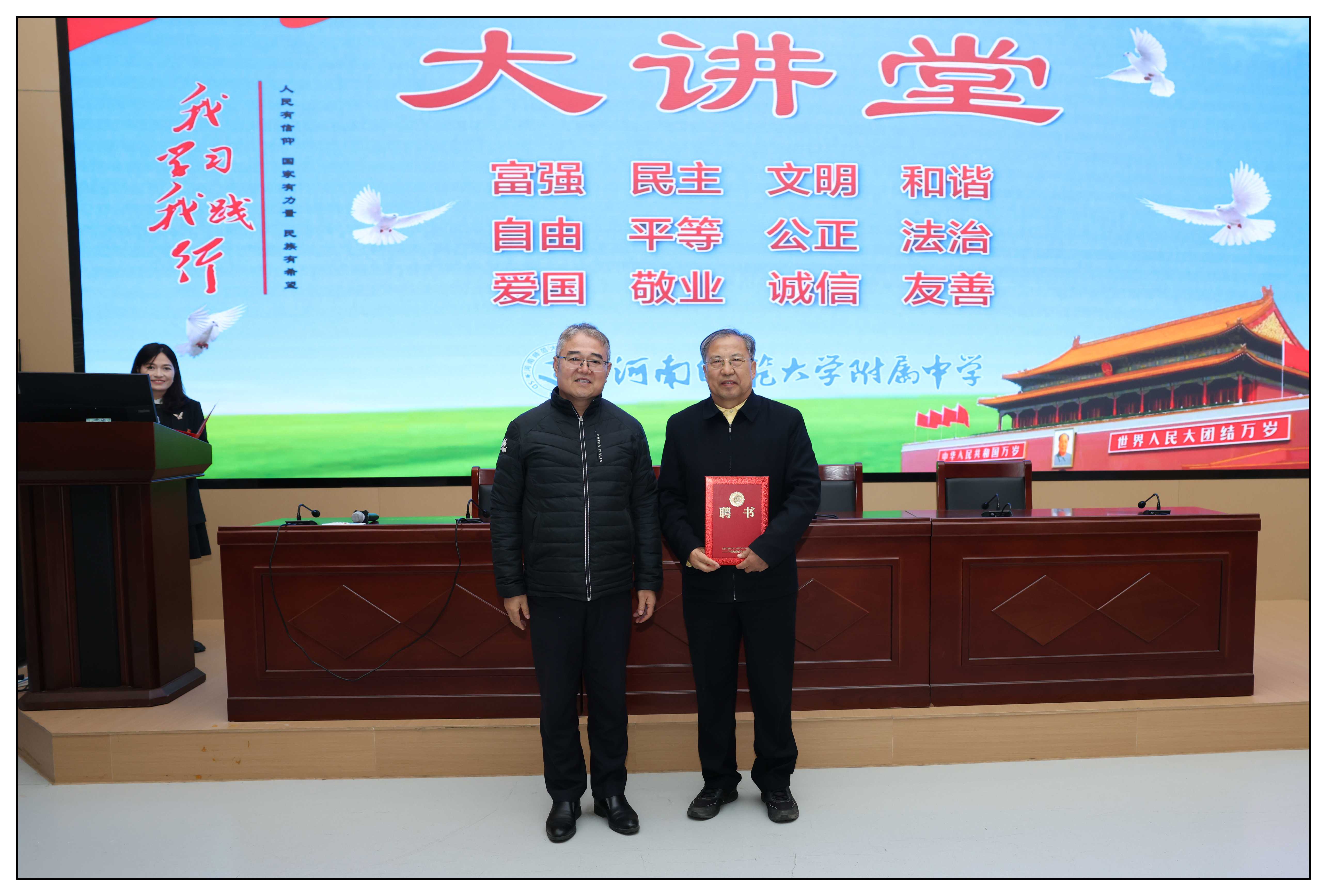 在全场热烈的掌声中,刘齐晋副书记代表学校向茹振钢教授颁发“思政课校外辅导员”聘书,学生代表郭子菡同学献上鲜花。